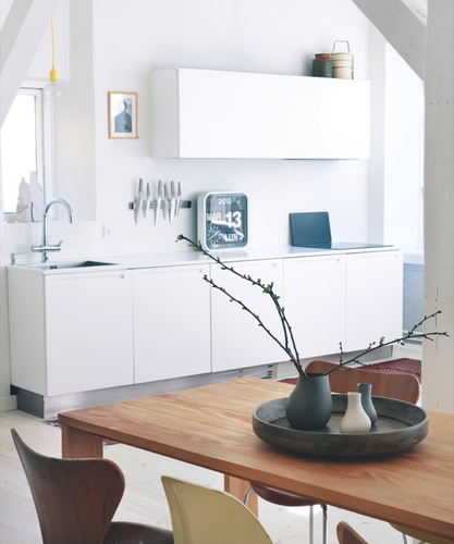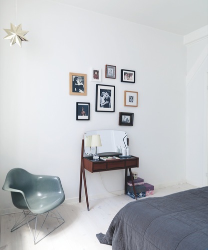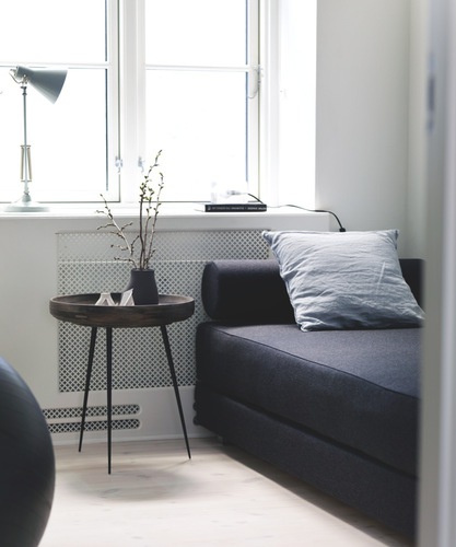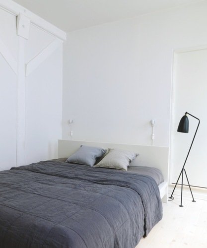 A lakás magán viseli a mai trendi északi otthonok összetéveszthetetlen stílusjegyeit: fehér falak, világos faanyag, kontrasztként karakteres fekete darabok, csíkos szőnyeg, egyszerű vonalvezetés, dizájnbútorok. Ez az irányzat meglehetősen sterilnek és puritánnak tűnik az aprólékosan megkomponált fényképeken, engem azonban valamiért nagyon inspriál tisztasága és mértéktartó berendezése.